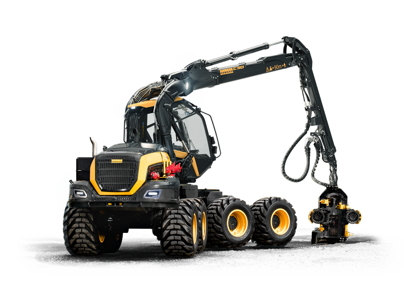 The stability of the harvester comes from its eight wheels and active stabilization system. The patented stabilization system is based on detecting the crane direction and position, on the basis of which the rear frame is pressed in the working direction. Pressing the rear wheels against the ground and the weight of the rear frame improve the machine’s stability significantly when working on the side of the machine – also when the machine is moving.
