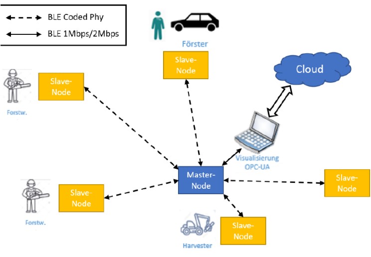 Improved work safety through a sensor node network which connects to anyone carrying such a node and provides information about the current danger situation over a license-free band using Bluetooth low energy (BLE). For example: in a tree felling operation with a harvester which is supported by a forest worker, any person with such a little IT-device in his / her pocket (such as supervision personal, field forester, …) will get information about the position of the harvester and the work the harvester is doing. On the other hand, also the harvester has the information about these people. Risk alert warnings are sent to actors automatically, risk zones and risk status can be retrieved from actors, offenses of critical overlaps in risk safety zones are identified. The system is using u-Blox M8N GPS modules and map visualization on screens. The information gets translated to a danger situation depending on the individual work-situation (for example larger danger area when the harvester is cutting a tree than while driving). Communication of 150 - 700m, up to 9 slave nodes and battery allows 50h usage. GPS accuracy around 2.5m under forest conditions. The system may connect to a Cloud. This opens further data processing options, such as inclusion of passers-by via GSM-net or team-oriented data analysis for work-safety education needs.